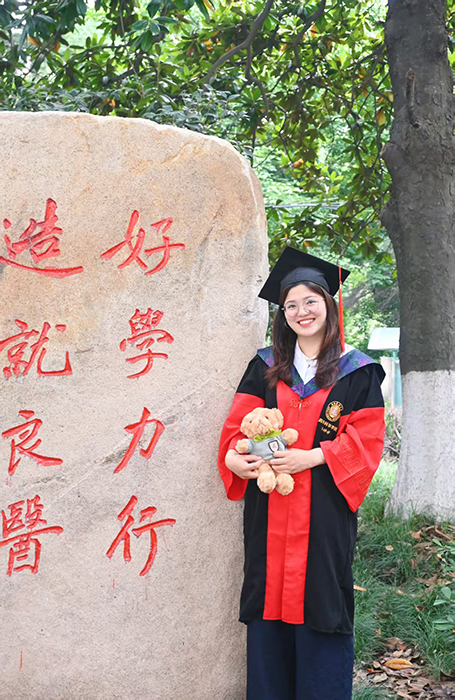 2025年毕业典礼结束后,一位身着博士红袍的女生笑靥如花,拿着心爱的小熊玩偶在校训石旁留下一张青春的倩影。她就是安徽省2025年优秀毕业研究生,来自药学科学学院的2025届博士毕业生陈婷婷。
